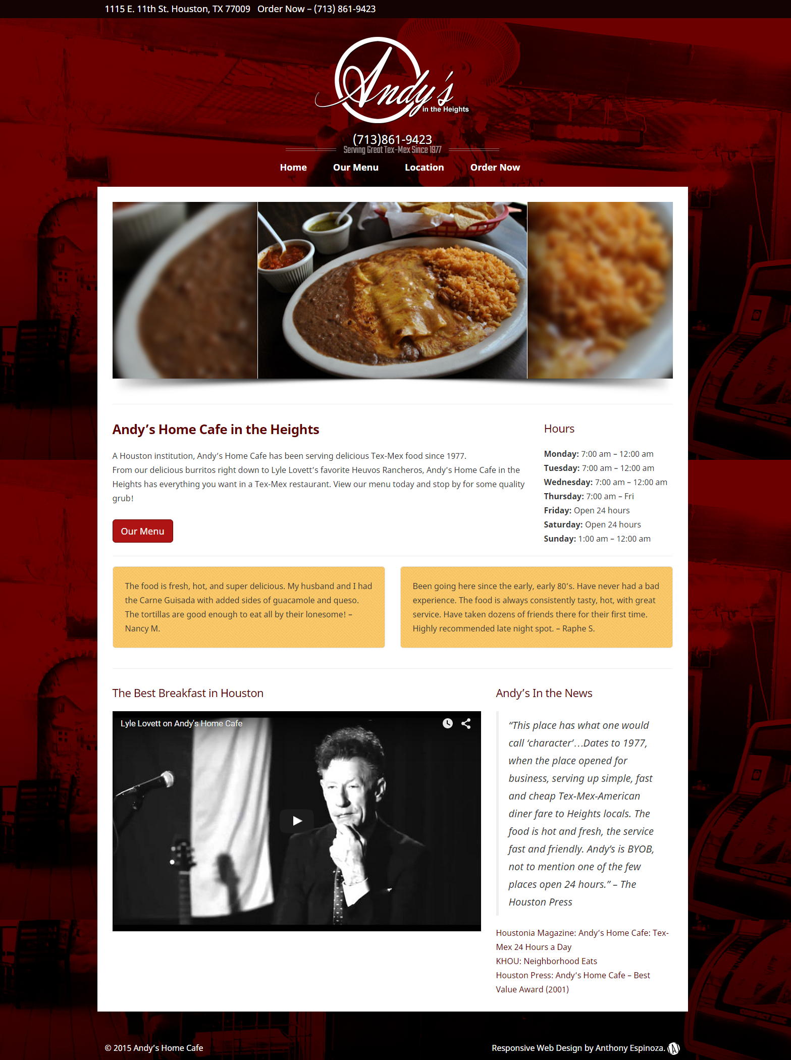 Andy’s Home Cafe is a Houston institution. Serving great tex-mex in the Houston Heights area since 1977, I was excited to be asked to develop a web presence for such an established pillar of the community. This particular website was built in wordpress to make menu changes simpler and to allow anyone to edit the rest of the content. I also equipped this site with some custom analytics reporting so we can monitor how much business the website is bringing in.