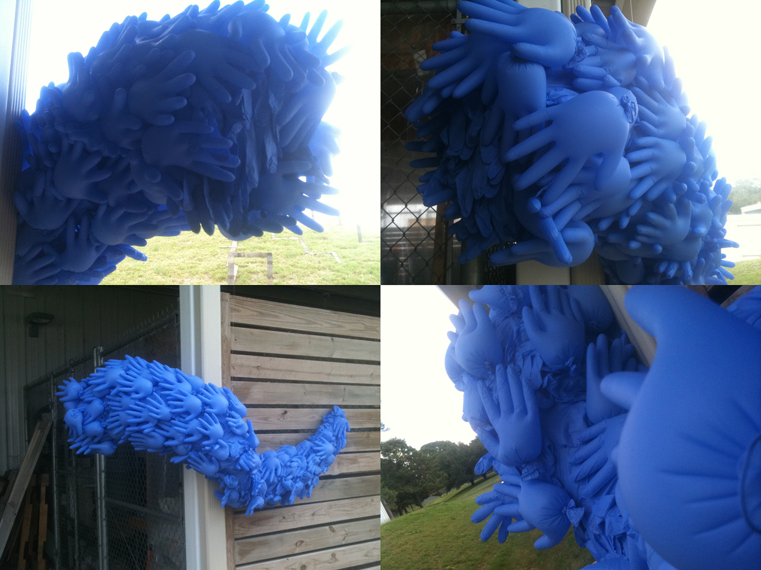Modular art is taking many of one object, or modules, and taking them to create a much larger work of art. In this case I used blue surgical gloves, blew them up and formed them into an odd looking worm that, on one half hangs on a wall and the other half suspends in mid-air. The idea behind this was that students would walk out of the back door of the WASH building and see the worm peeking out at them. The mouth of the work is covered with a flat wall of gloves to encourage students to stick their hand inside of the “beast.” Click the thumbnail to see more views of this work.